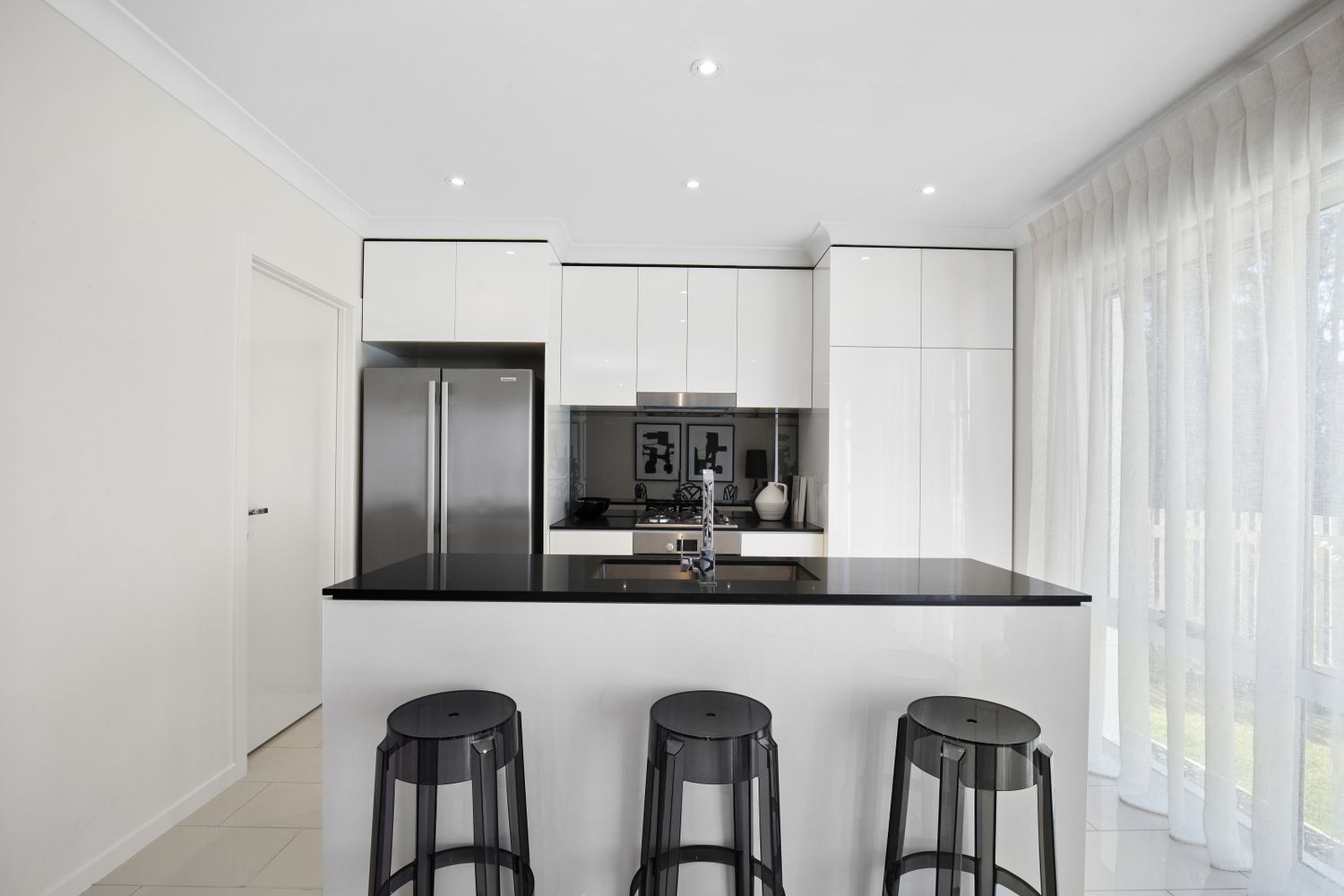 - Gourmet kitchen with stone benchtops, mirrored splashback, and stainless-steel appliances