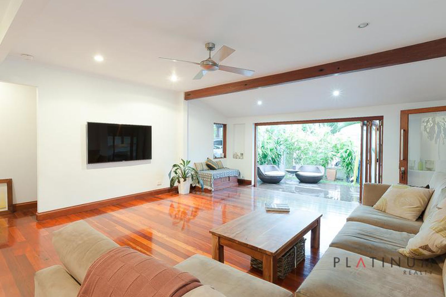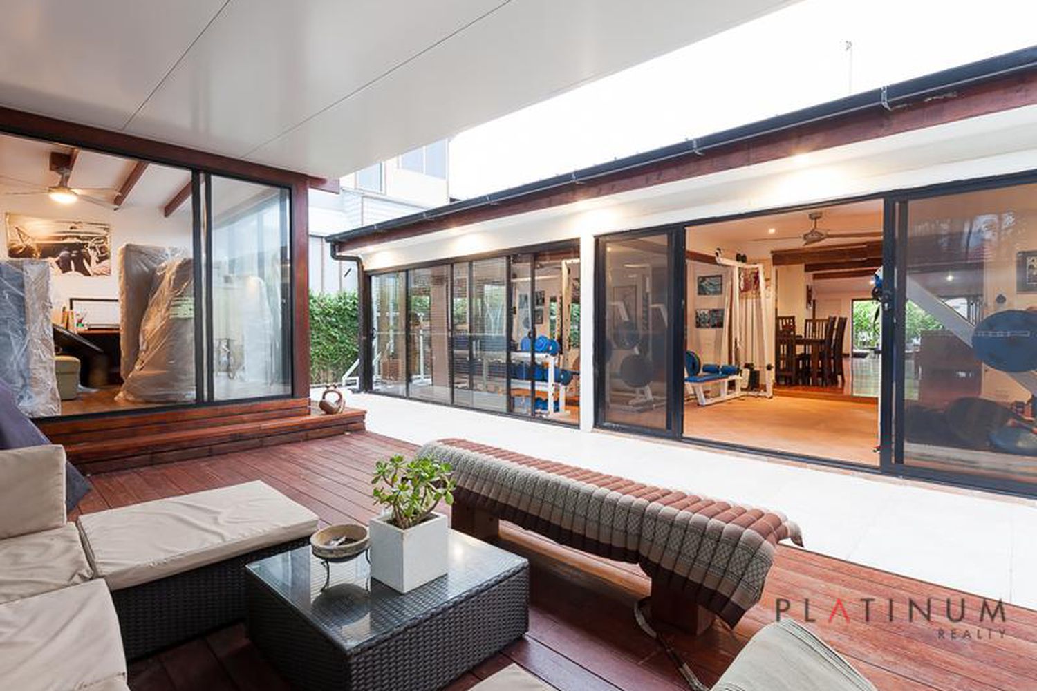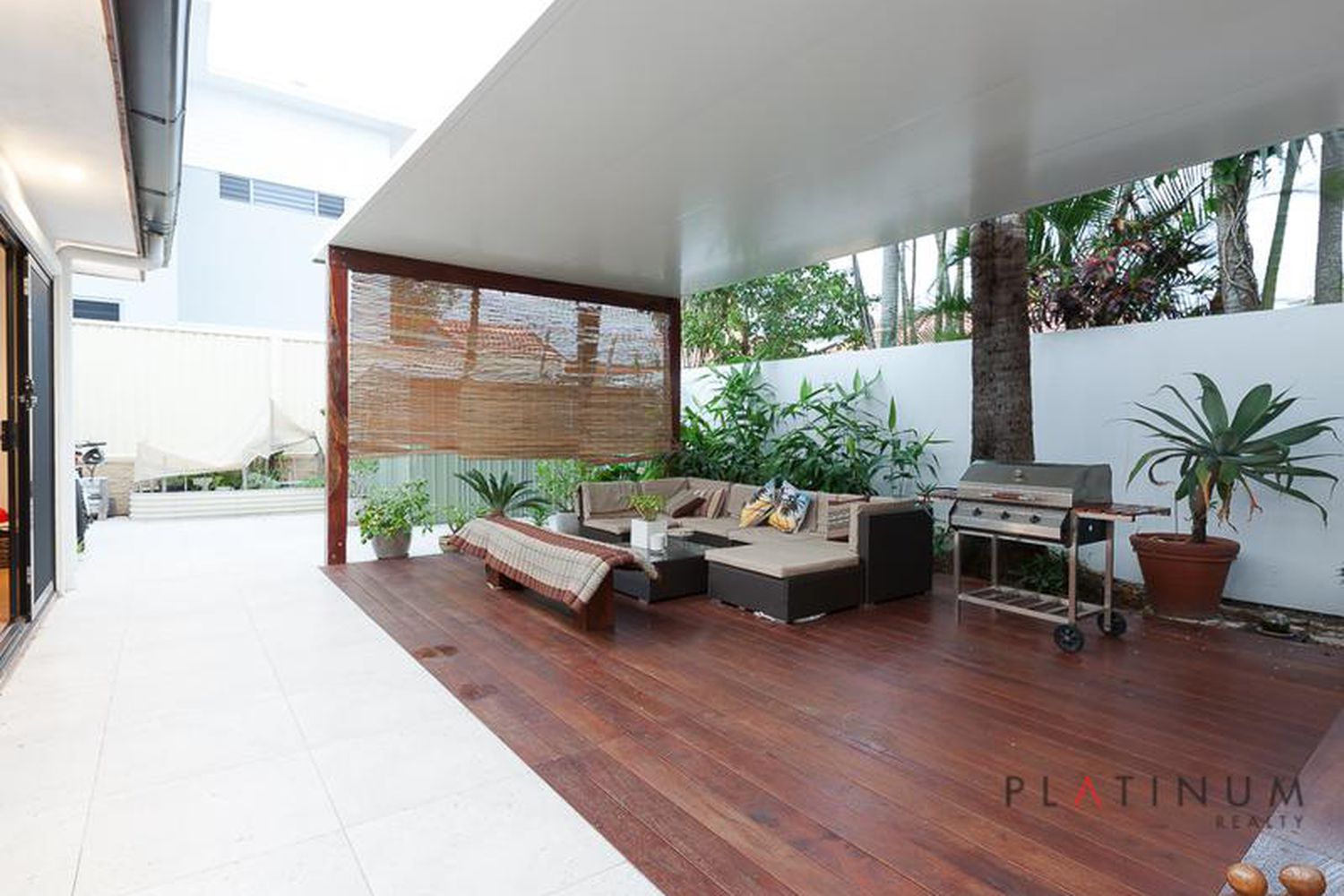 The glass doors retreat back to provide a seamless transition outdoors, to an enticing rear timber deck, which is fully under cover and surrounded by private, tropical gardens. This secluded, outdoor sanctuary really does have a resort style feel.